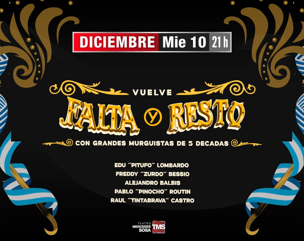 Falta y Resto celebra 50 años de murga con un espectáculo irrepetible que reúne a los mejores murguistas de las últimas cinco décadas. Desde sus primeros acordes hasta las nuevas generaciones, Falta y Resto marcó un camino de arte, carnaval y resistencia, llevando la murga a escenarios de todo el mundo y conquistando corazones con su poesía y compromiso social. Hoy, medio siglo después, la magia vuelve a cobrar vida en un show donde se funden pasado, presente y futuro. Voces, colores y emociones que atraviesan generaciones se encuentran en una misma noche para celebrar la memoria colectiva y el espíritu murguero que nunca se apaga.